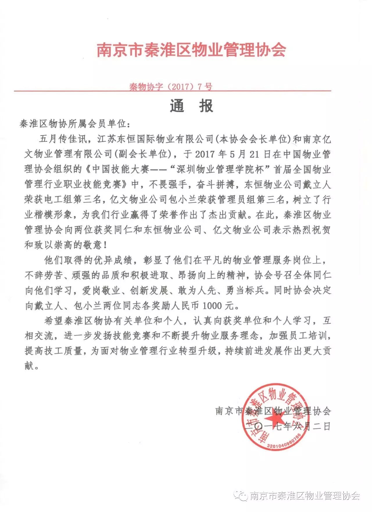 江苏东恒国际物业有限公司(本协会会长单位)和南京亿文物业管理有限公司(本协会副会长单位),于2017年5月21日在中国物业管理协会组织的《中国技能大赛——“深圳物业管理学院杯”首届全国物业管理行业职业技能竞赛》中,不畏强手,奋斗拼搏,东恒物业公司戴立人荣获电工组第三名,亿文物业公司包小兰荣获管理员组第三名。